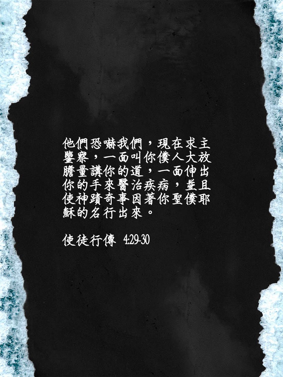 ? 他們恐嚇我們,現在求主鑒察,一面叫你僕人大放膽量講你的道,一面伸出你的手來醫治疾病,並且使神蹟奇事因著你聖僕耶穌的名行出來。徒4:29-30