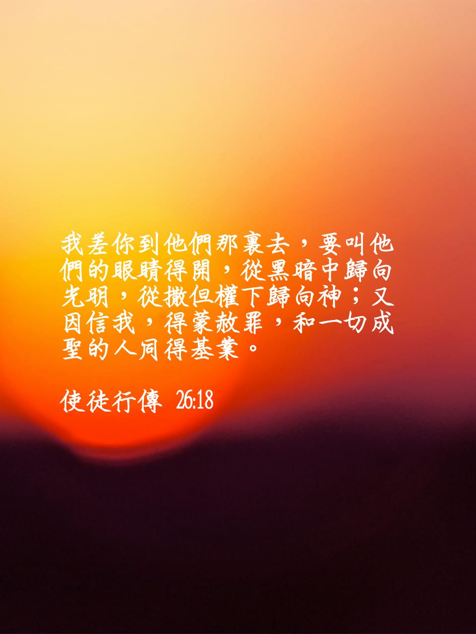 ? 我差你到他們那裏去,要叫他們的眼睛得開,從黑暗中歸向光明,從撒旦權下歸向神;又因信我,得蒙赦罪,和一切成聖的人同得基業。 徒26:18