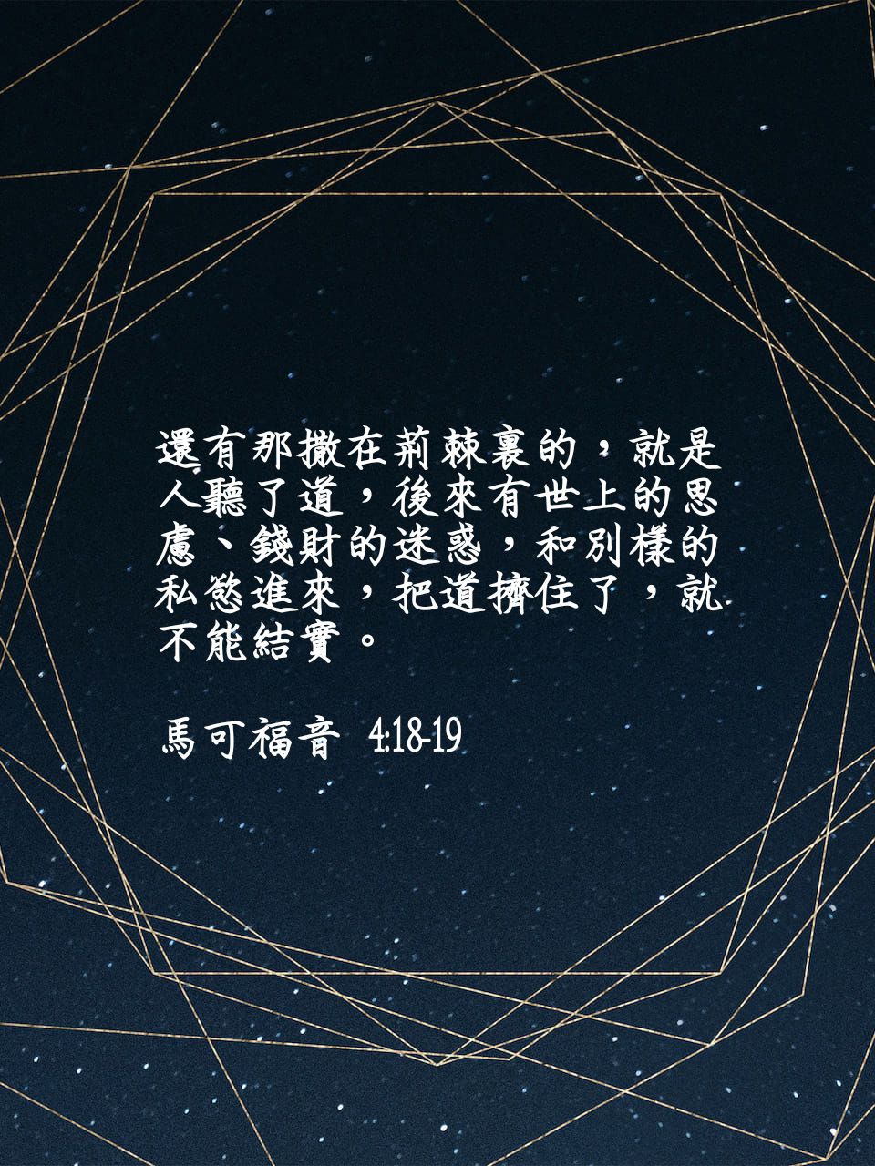 ? 還有那撒在荊棘裡的,就是人聽了道,後來有世上的思慮、錢財的迷惑,和別樣的私慾進來,把道擠住了,就不能結實。 可4:18-19