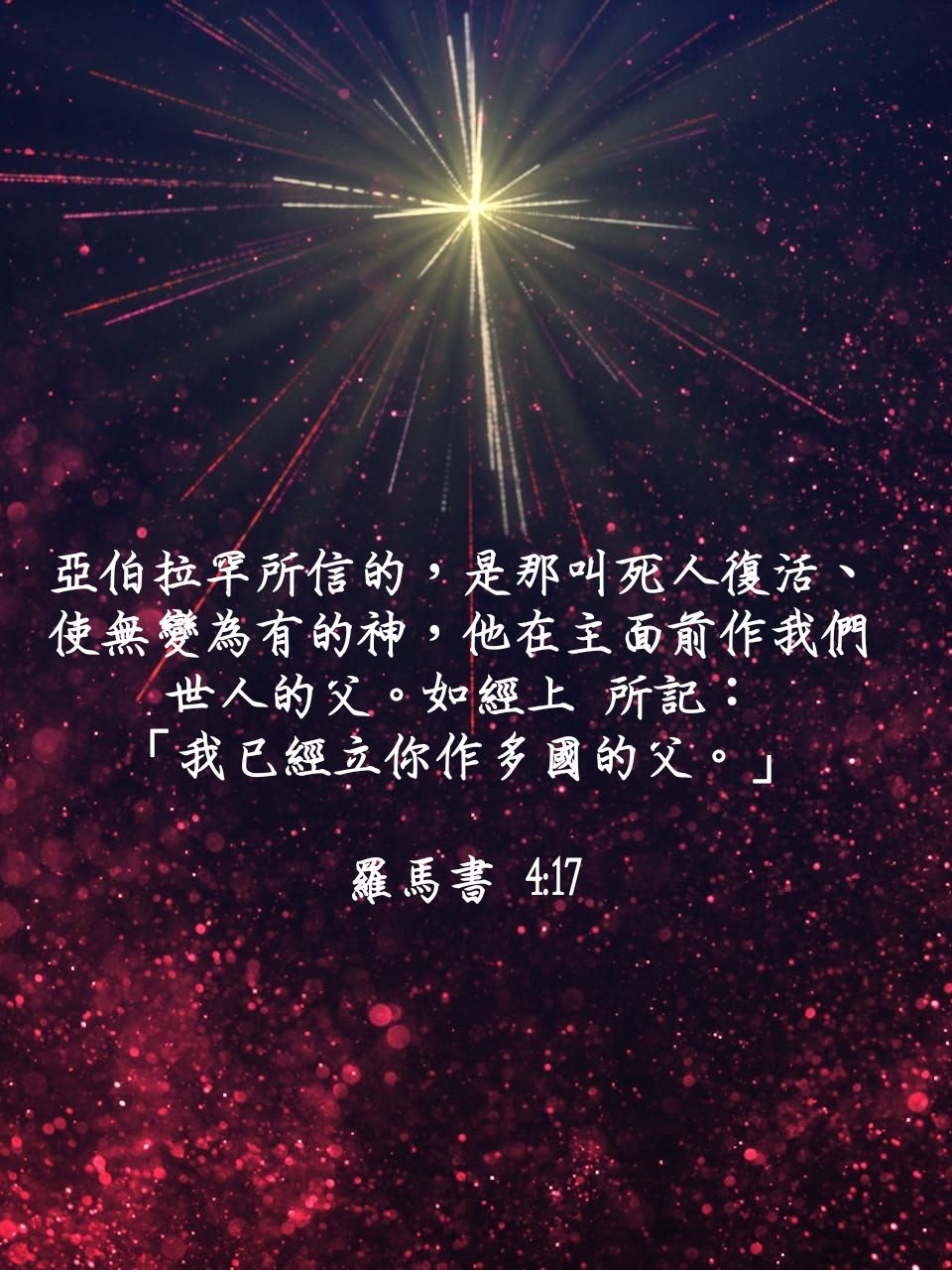 「你們若有信心像一粒芥菜種,就是對這座山說,你從這邊挪到那邊,它也必挪去!並且你們沒有一件不能做的事了」。求主將亞伯拉罕的信心賜給我;相信你會使死人復活、使無變有。